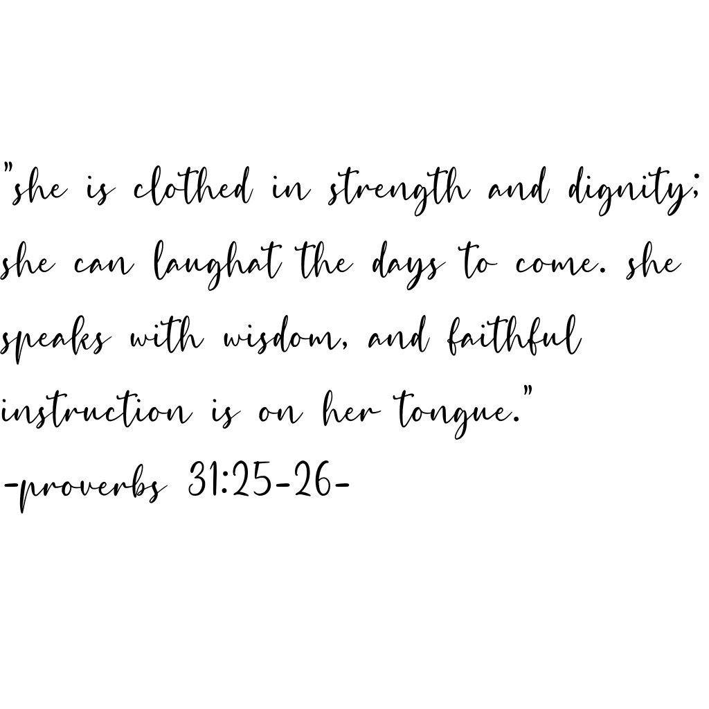 Proverbs 31:25-26 states, “She is clothed in strength and dignity; she can laugh at the days to come. She speaks with wisdom, and faithful instruction is on her tongue.”